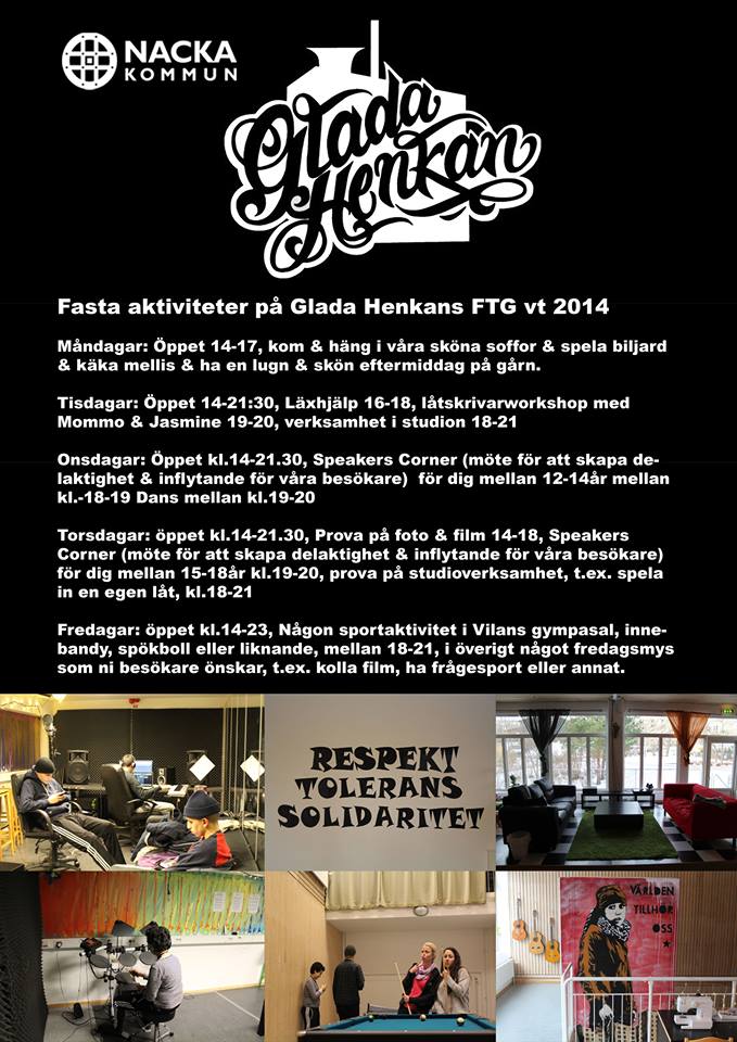 Denna vår erbjuder Glada Henkans fritidsgård på Henriksdalsberget bl.a. låtskrivarworkshop, Speakers Corner, prova på musikstudio, sport i Vilans gympasal, häng, biljard och fredagsmys.