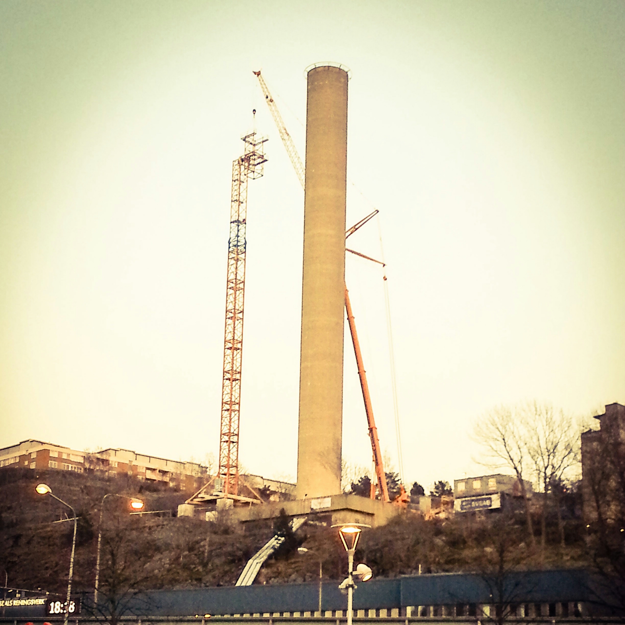 I fredags hoppade två okända med var sin fallskärm från lyftkranen som används vid Henriksdals reningsverk för renoveringen av skorstenen.