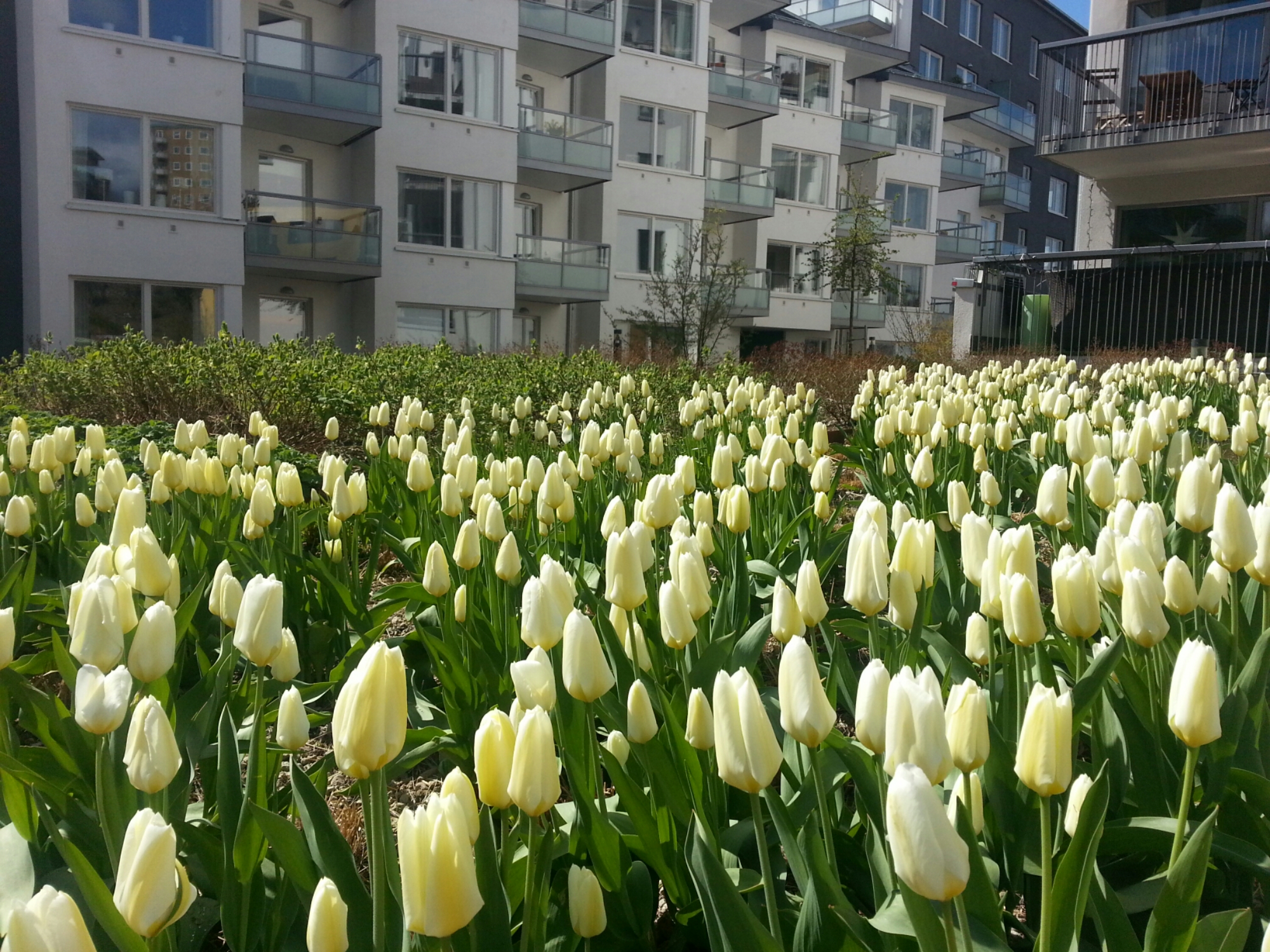 När man sätter foten på kvarteret Båtklubbens innergård i Henriksdalshamnen möts man av hundratals vita tulpaner.