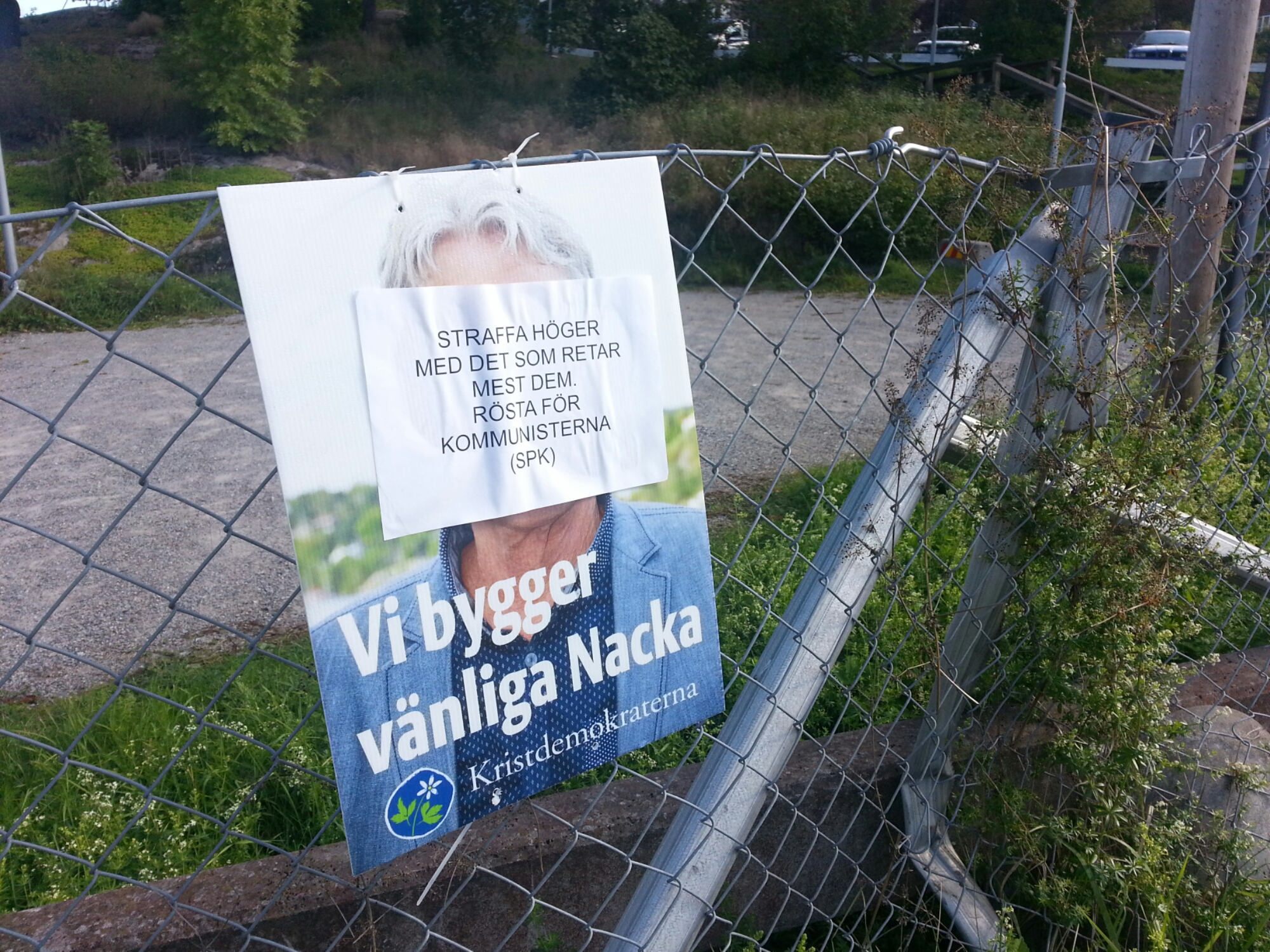 Ett mindre kommunistiskt parti har klistrat över framförallt Kristdemokraternas och Centerpartiets valaffischer nedanför Danvikshem och i Saltsjöqvarn.