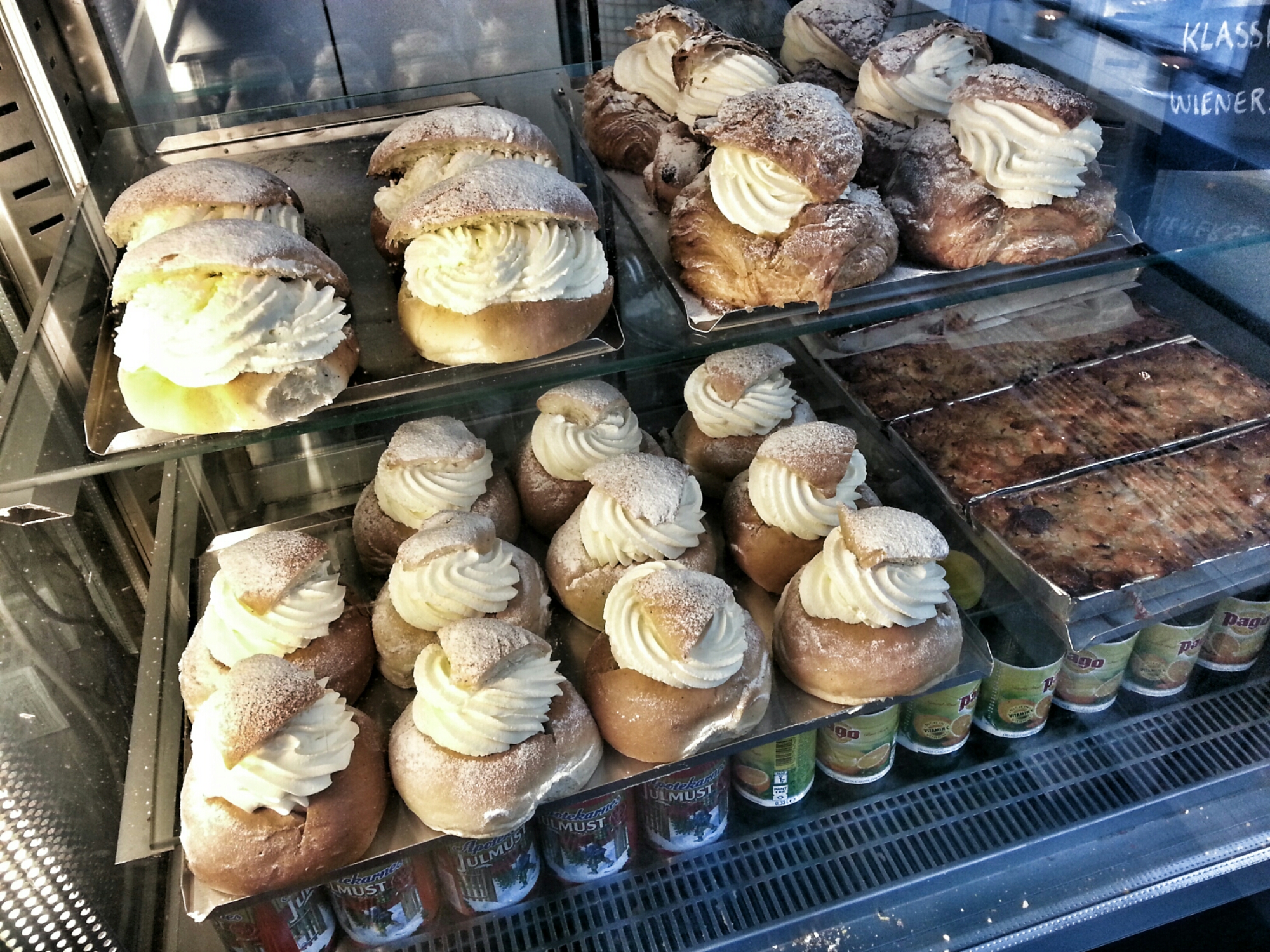 Bakom glaset såg jag tre olika slags semlor: Klassisk semla, semla med vaniljsås i botten och Wienersemlan som jag också köpte.