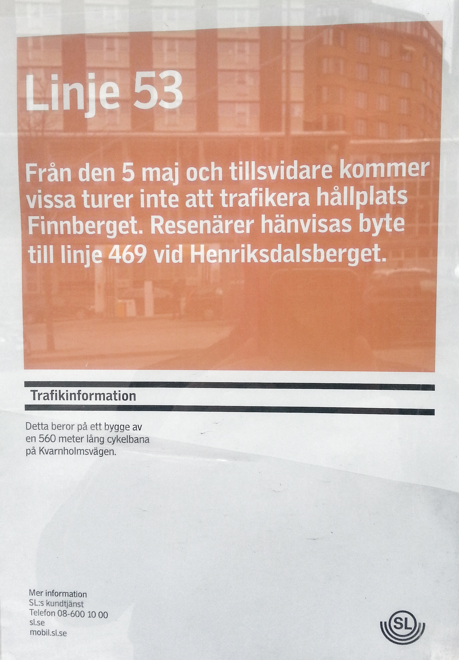Observera att SL har ett år gammal information på sina hållplatser om trafikering av Finnberget.