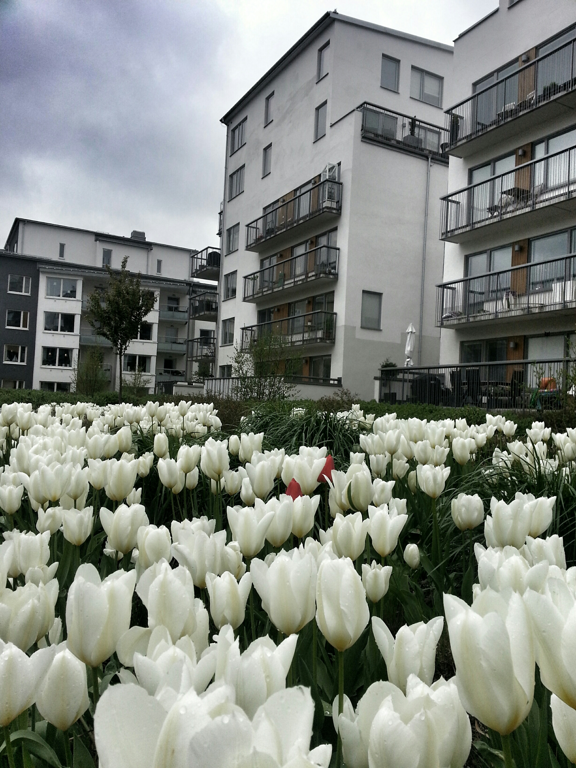Däremot kan du bli glad av att se de hundratals vita tulpanerna på innergården kvarter Båtklubben.