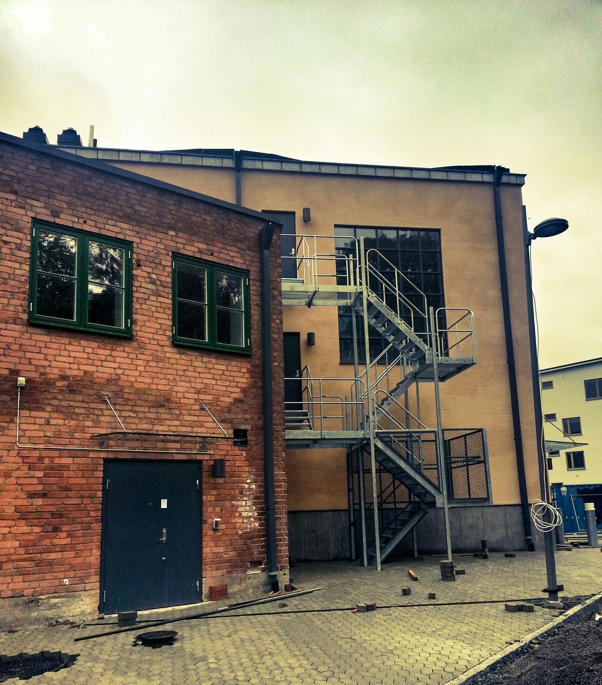 Finnboda varvs gamla spantverkstad hade rasat ihop vid tidigare rivningsarbeten men är nu alltså återställd inför butikssöppningen i början av september 2015. Även gångväg och torg håller man på att stenlägga.