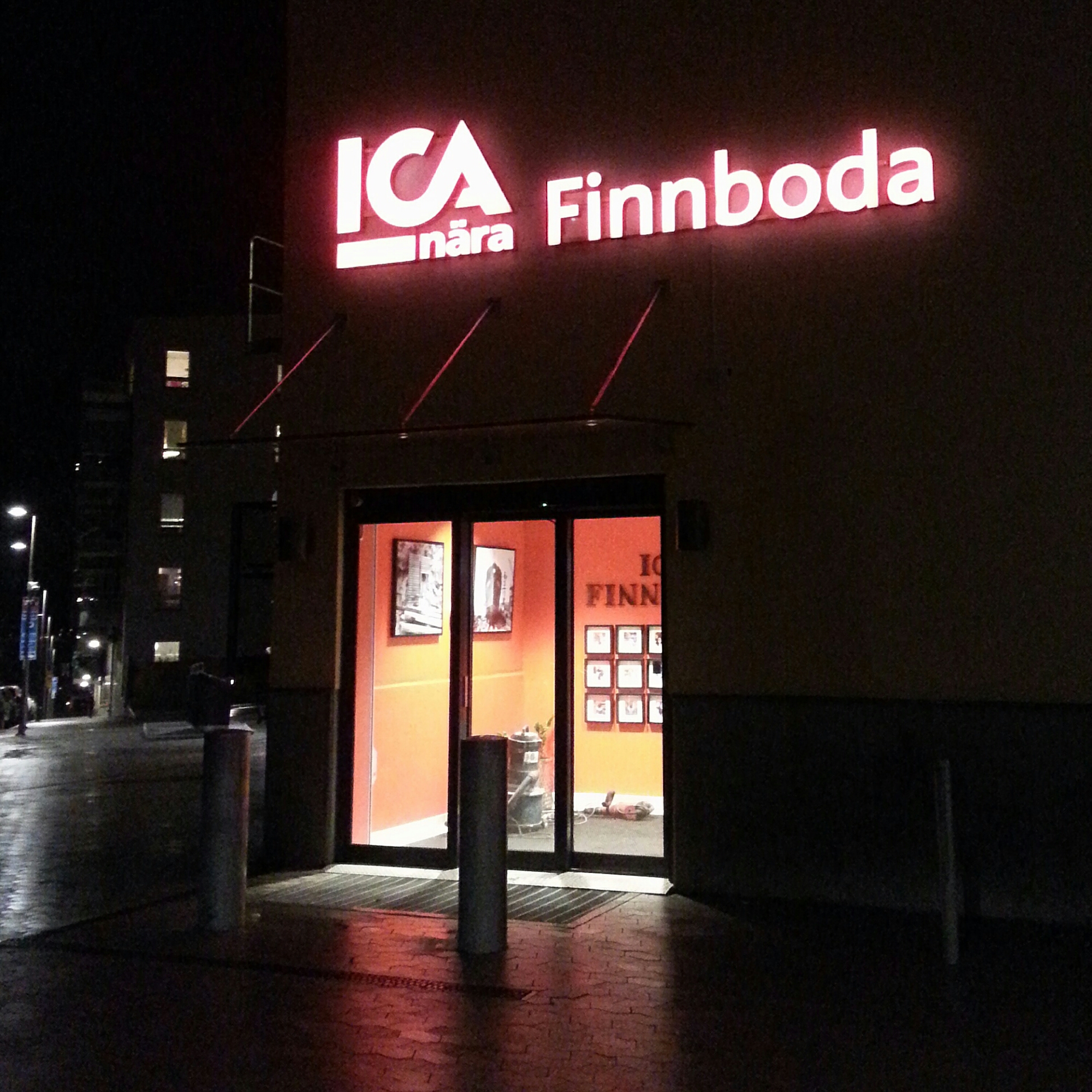 ICA Finnboda har fått en fin röd neonskylt på framsidans fasad.