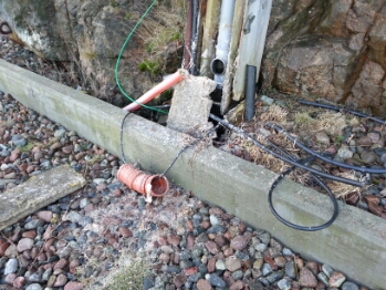 När fastighetens tanknär full så forsar det brunt vatten ut via trasiga avloppsledningarna på kajen där även elkablar sticker ut.