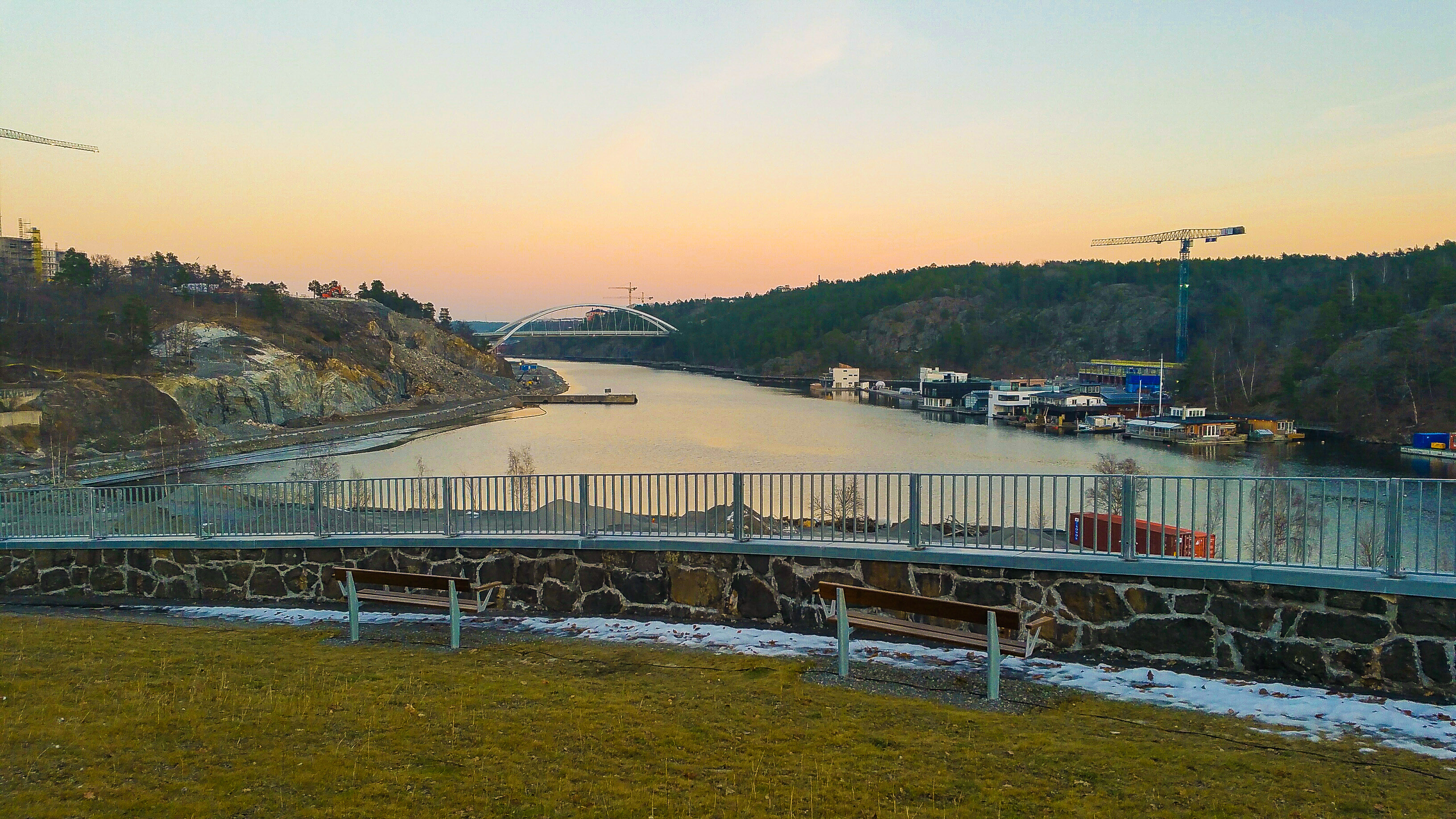 Härifrån ser du Södra kajen på Kvarnholmen där KUAB bygger, Kvarnholmsbron (egentligen Svindersviksbron), urskogen Ryssbergen som fortfarande väntar på att bli naturreservat och Marinstaden som aldrig blir klar.