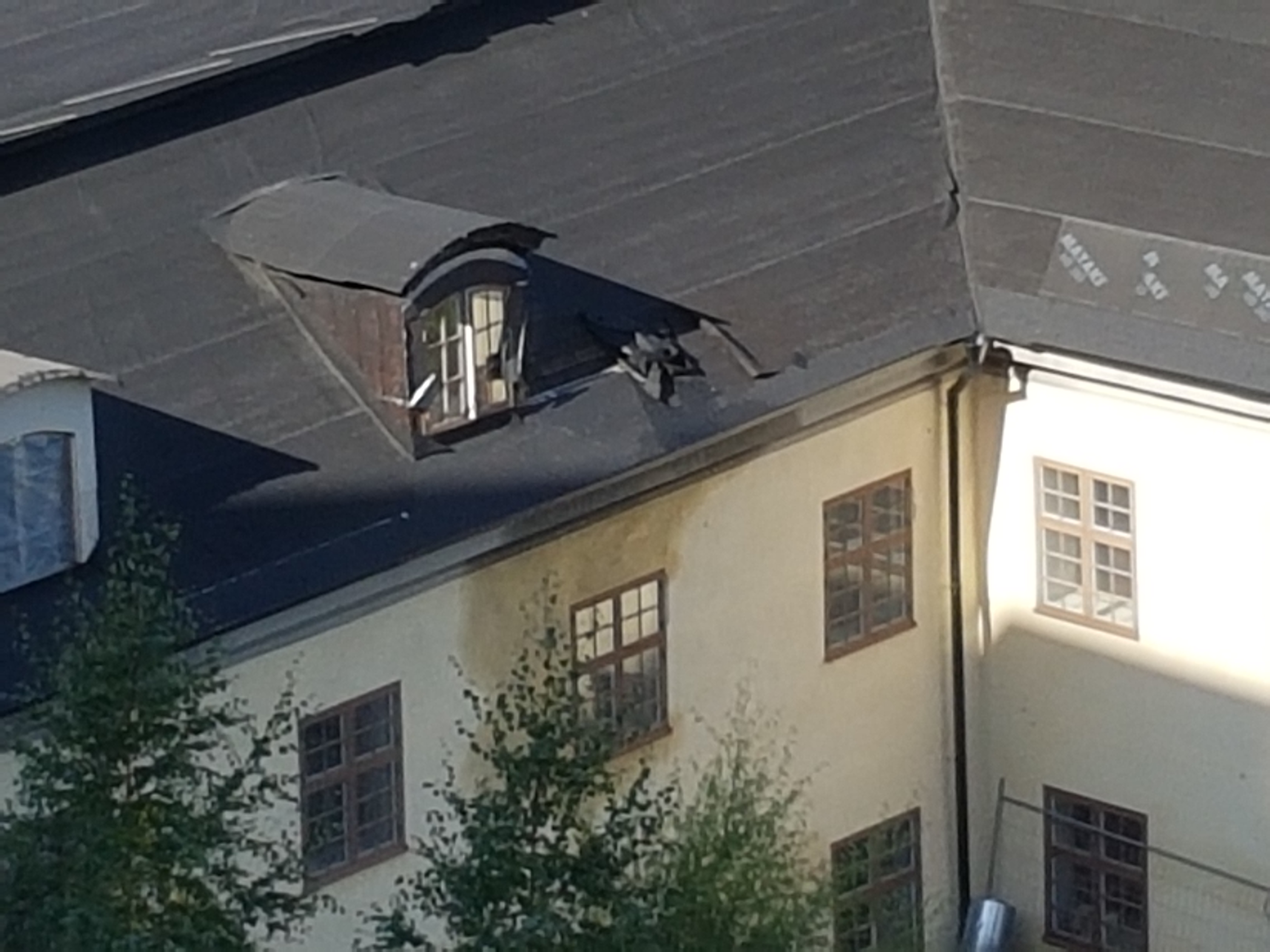 Vid senaste försöket att iordningsställa byggnaden tog plåttaket bort på östra sidan. Underlagspappet blåser ständigt bort vilket innebär att det regnar rakt in i konstruktionen.