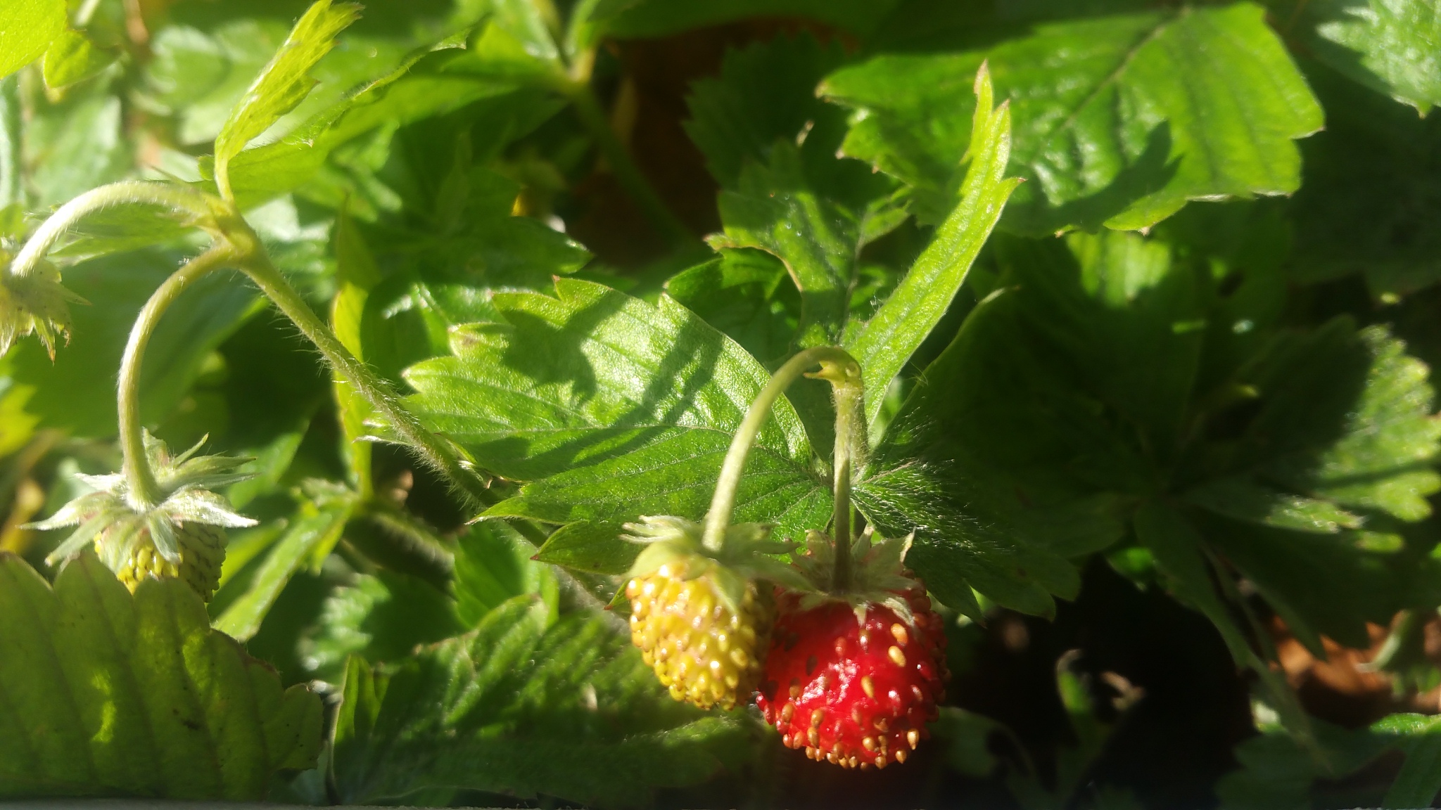 Där blommar smultronen. Flera plantor har gröna bär och några är redan mogna.