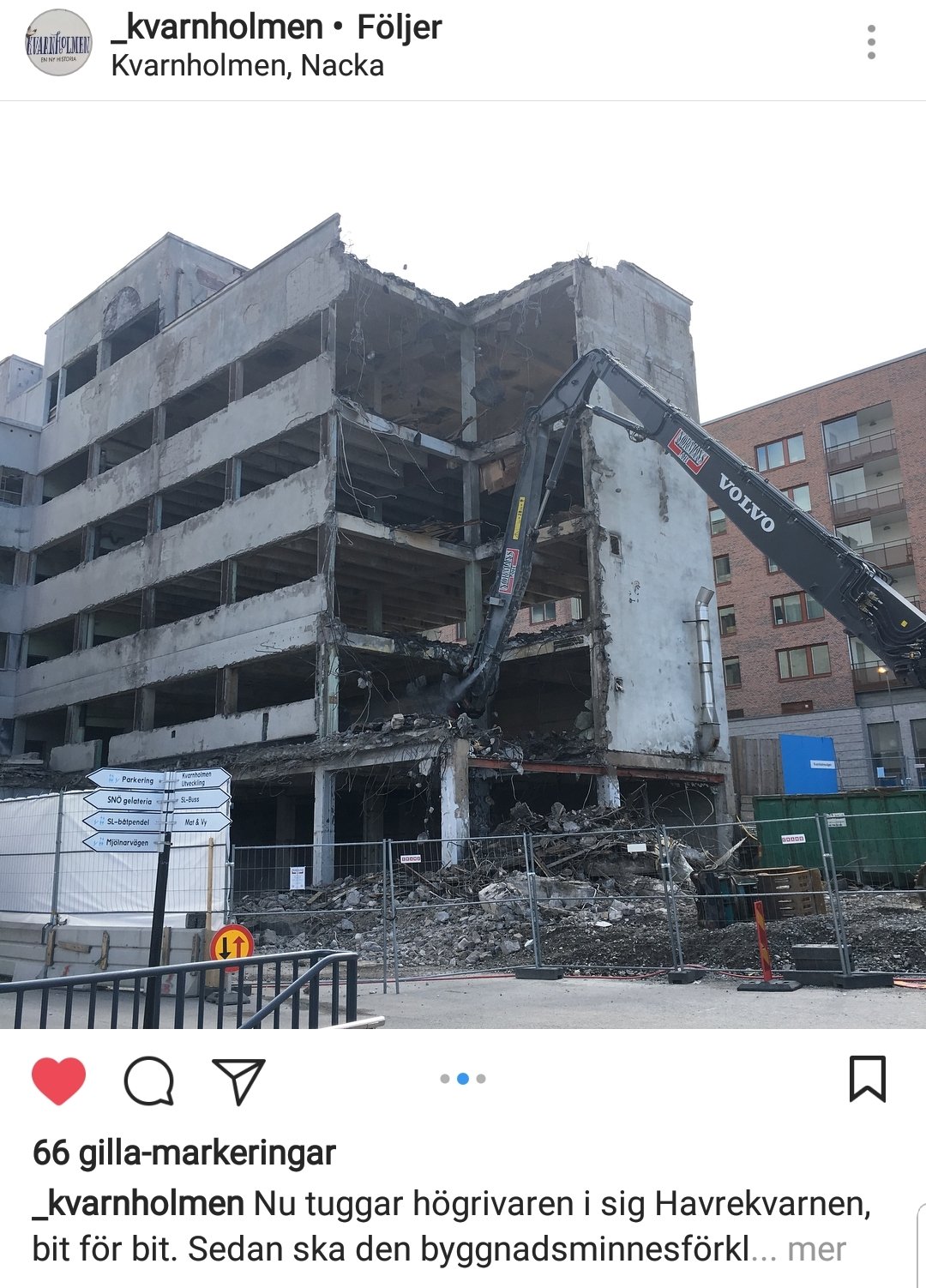 I dagarna började Kuab rivningen av byggnadsminnesmärkta havrekvarnen på Kvarnholmen i Nacka. Men sommaren 2020 ska en nybyggd kopia stå klart.