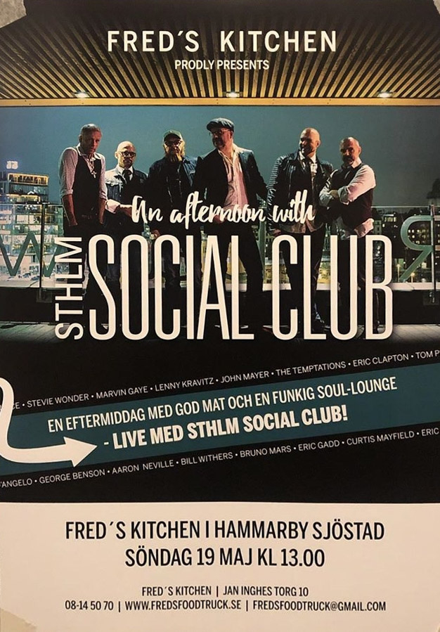 Söndag, 19 maj klockan 13:00 spelar Sthlm Social Club på Fred’s Kitchen 10 på Jan Inghes torg i Henriksdalshamnen.