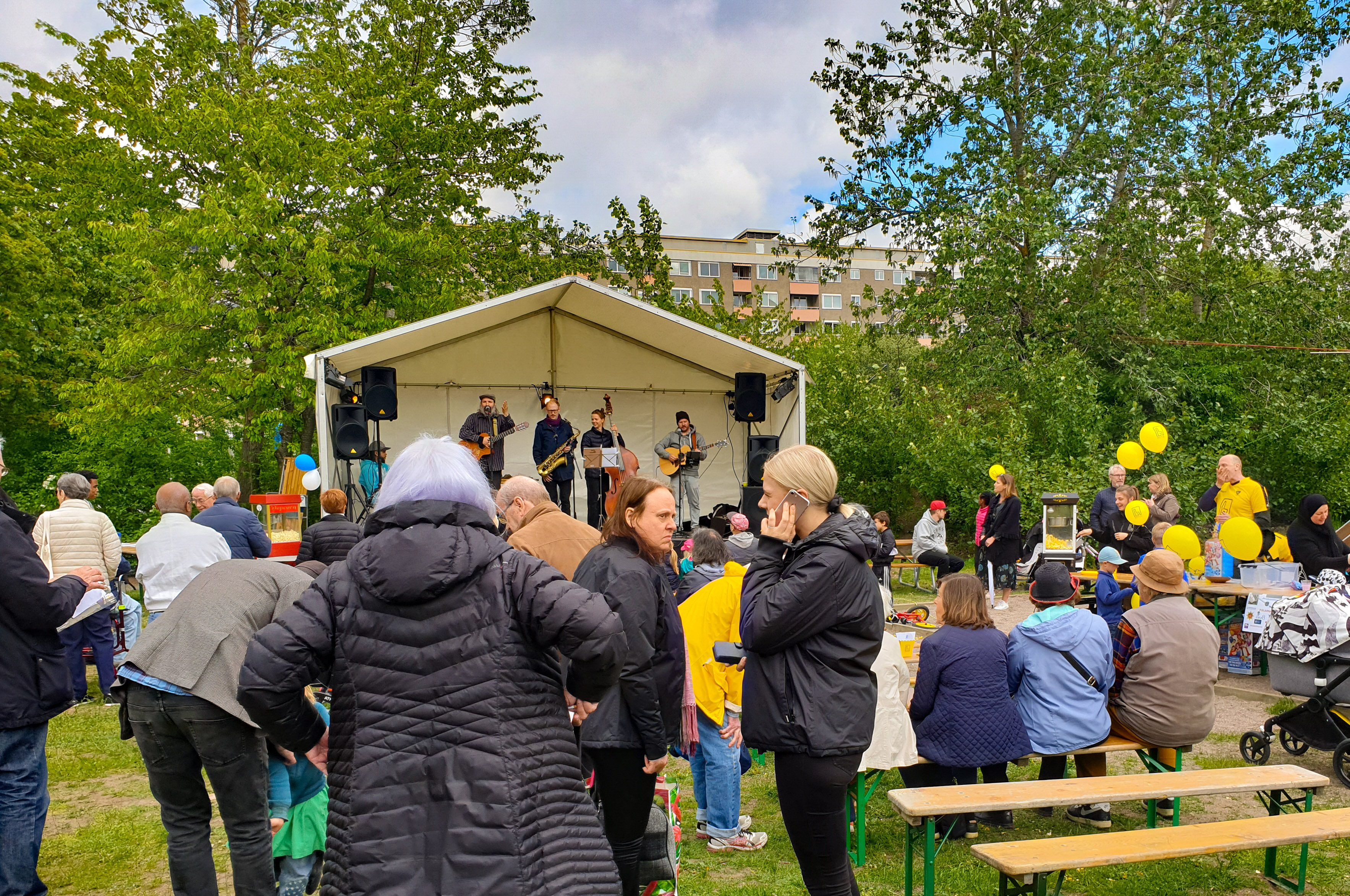 25 maj firade många nya, gamla och tidigare Henkanbor Henriksdalsringens 50 årsjubileum 🎉 med musik, bildutställning, hoppborg, veteranbilar, tårta 🍰, korvgrillning, tipspromenad och ett tal kritisk mot Nacka kommuns byggplaner.