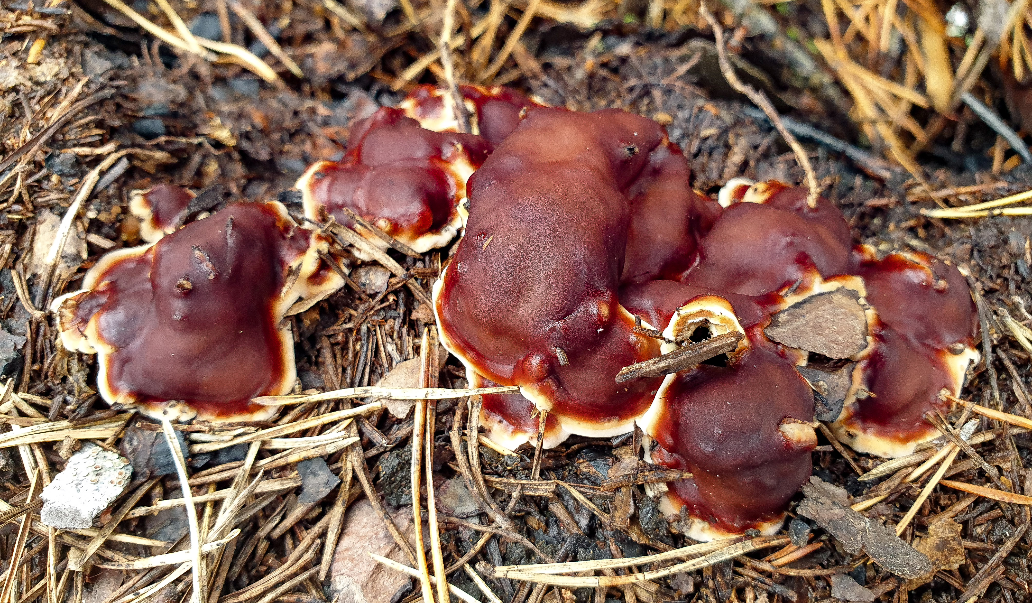 Bakom barnens träd nedanför en tall där det har brunnit hittade vi en grupp med en kuddliknande chokladbrun svamp med ljusa marginaler: Rotmurkla eller Rhizina undulata.