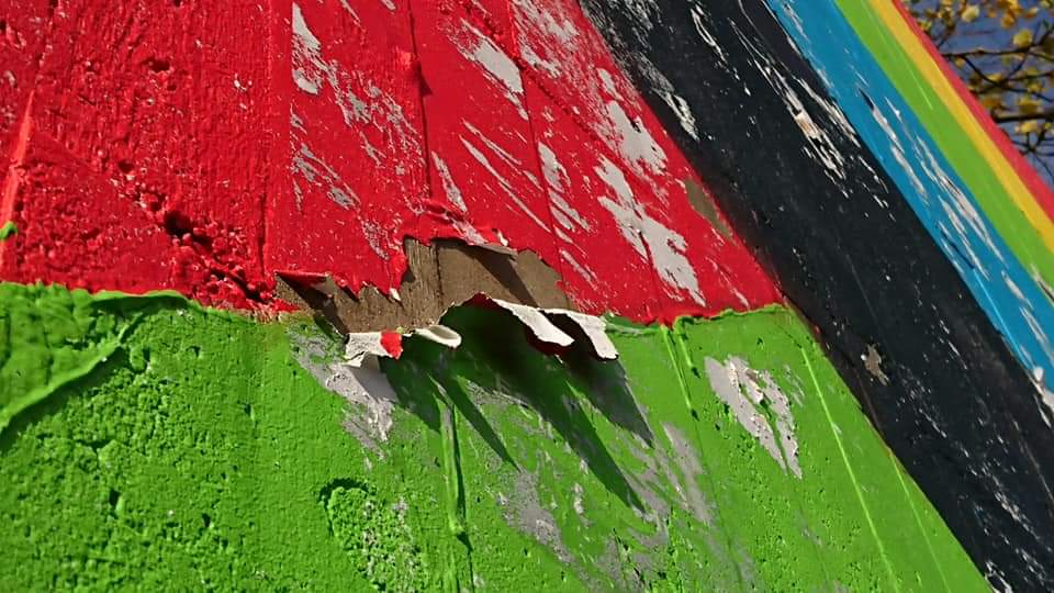 Dels verkar färgen gå av. Dels har den övermålats / klottrats ner av okända.