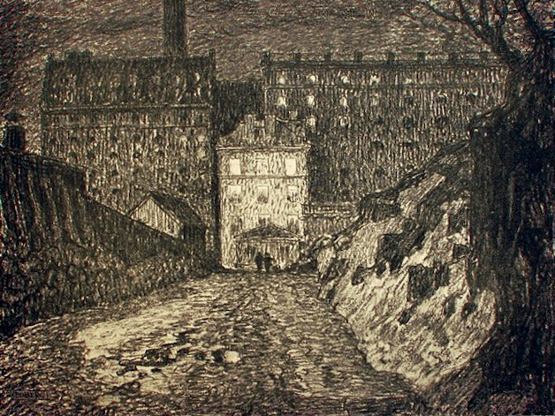 Ferdinand Boberg, 1917: Danviks krokar – pittoresk väg nedanför Danviksklippan från Södermalm till Nacka med bl.a. smedjan Vulkansborg. Vägen försvann när Danvikskanalen sprängdes fram.