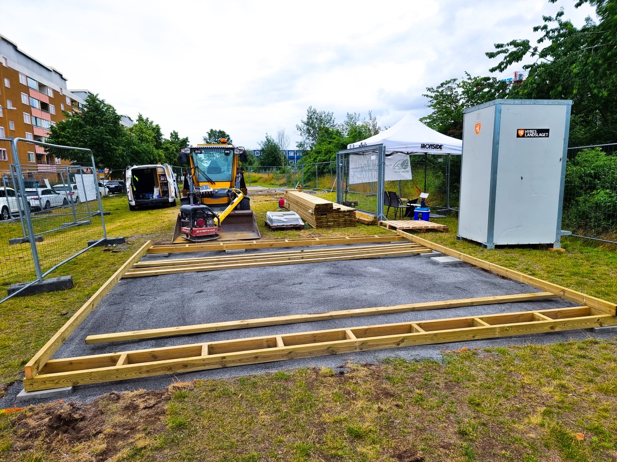 Det är Nacka kommun som just bygger två nya boulebanor, pergola, bänkar m.m. på gräsmattan intill Café Vy mellan Henriksdalsringen och reningsverket. Det enda som saknas är kanske en källa ned dricksvatten för att skäcka törsten.