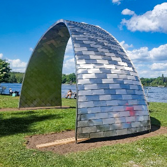 Det är en båge av plåt i vilken Kvarnholmen, Djurgården och Saltsjön speglar sig i.