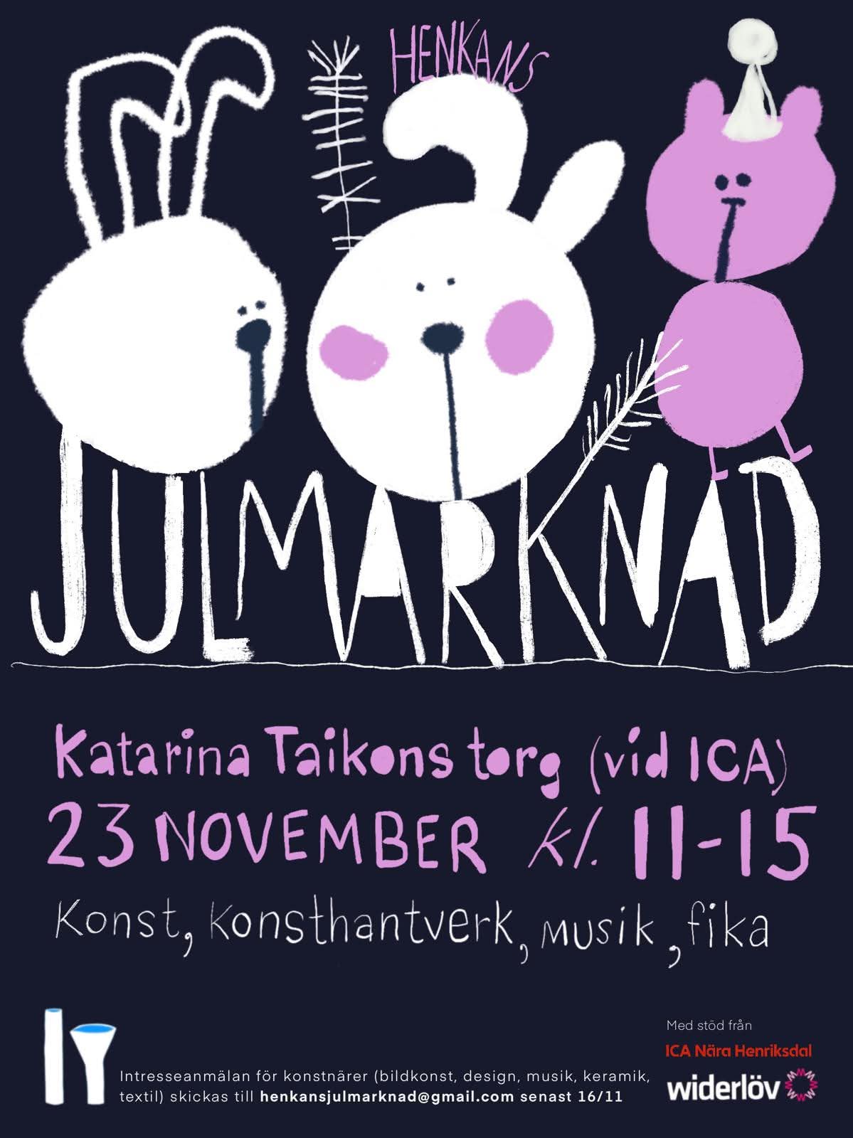 Du som vill ställa ut kan höra av sig till henkansjulmarknad@gmail.com senast 16 november. Hör även av dig om du bara vill hjälpa till att organisera julmarknaden.